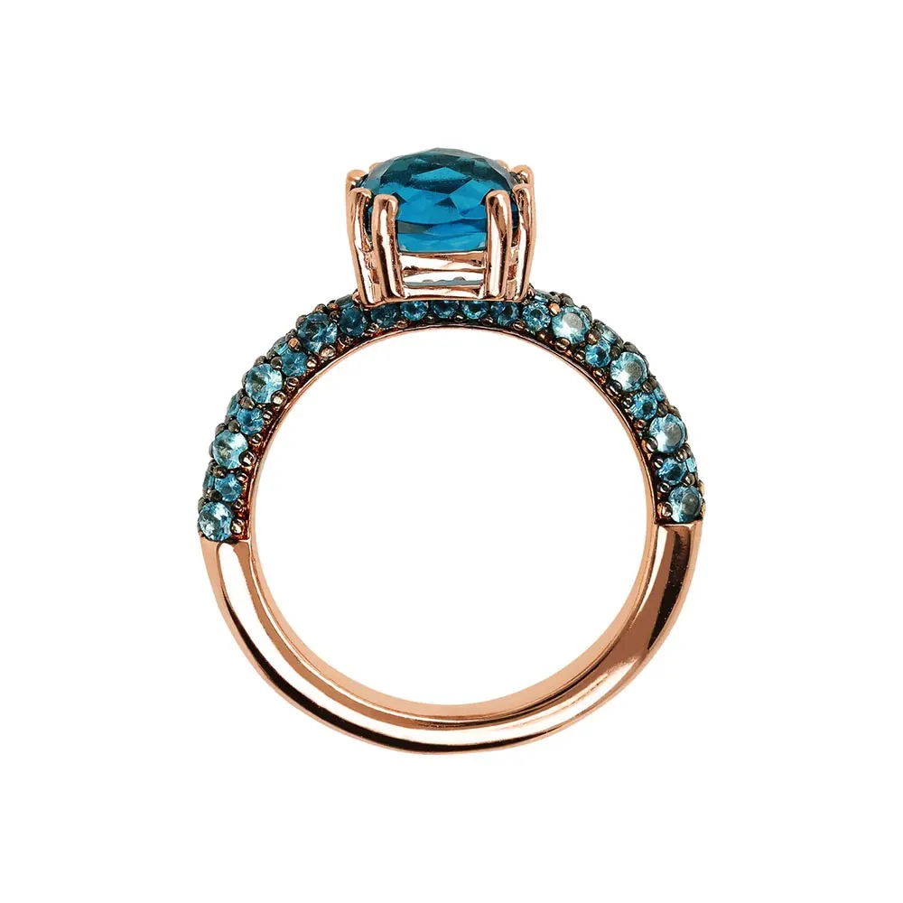 Anello a solitario della collezione Preziosa di Bronzallure, in Golden Rose placcato oro rosa 18 Kt con pavè di zirconi e cristallo blu taglio quadrato centrale.
