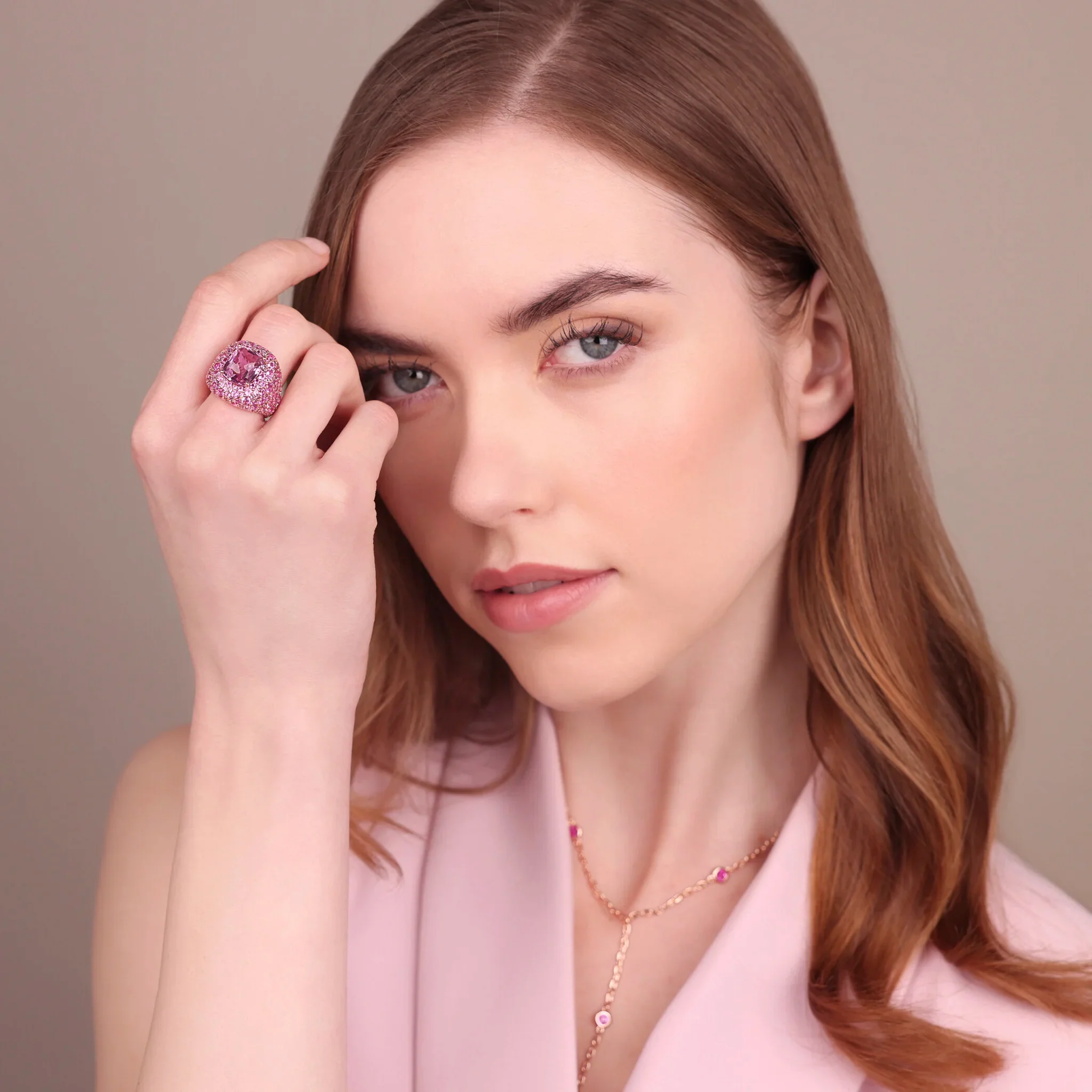 Anello chevalier Bronzallure realizzato in lega Golden Rosé, placcata Oro rosa 18kt, dal design graduato con superficie in pavé e pietra prisma gem centrale sfaccettata (12×10 mm).