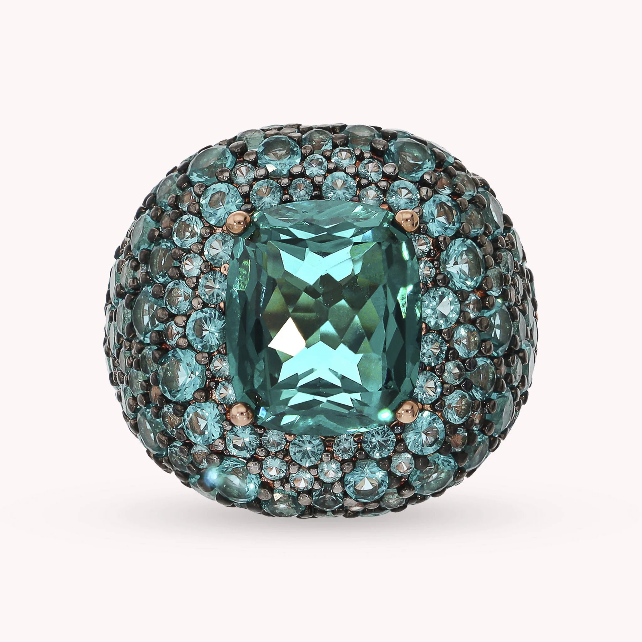 Anello chevalier Bronzallure realizzato in lega Golden Rosé, placcata Oro rosa 18kt, dal design graduato con superficie in pavé e pietra prisma gem centrale sfaccettata (12×10 mm).
