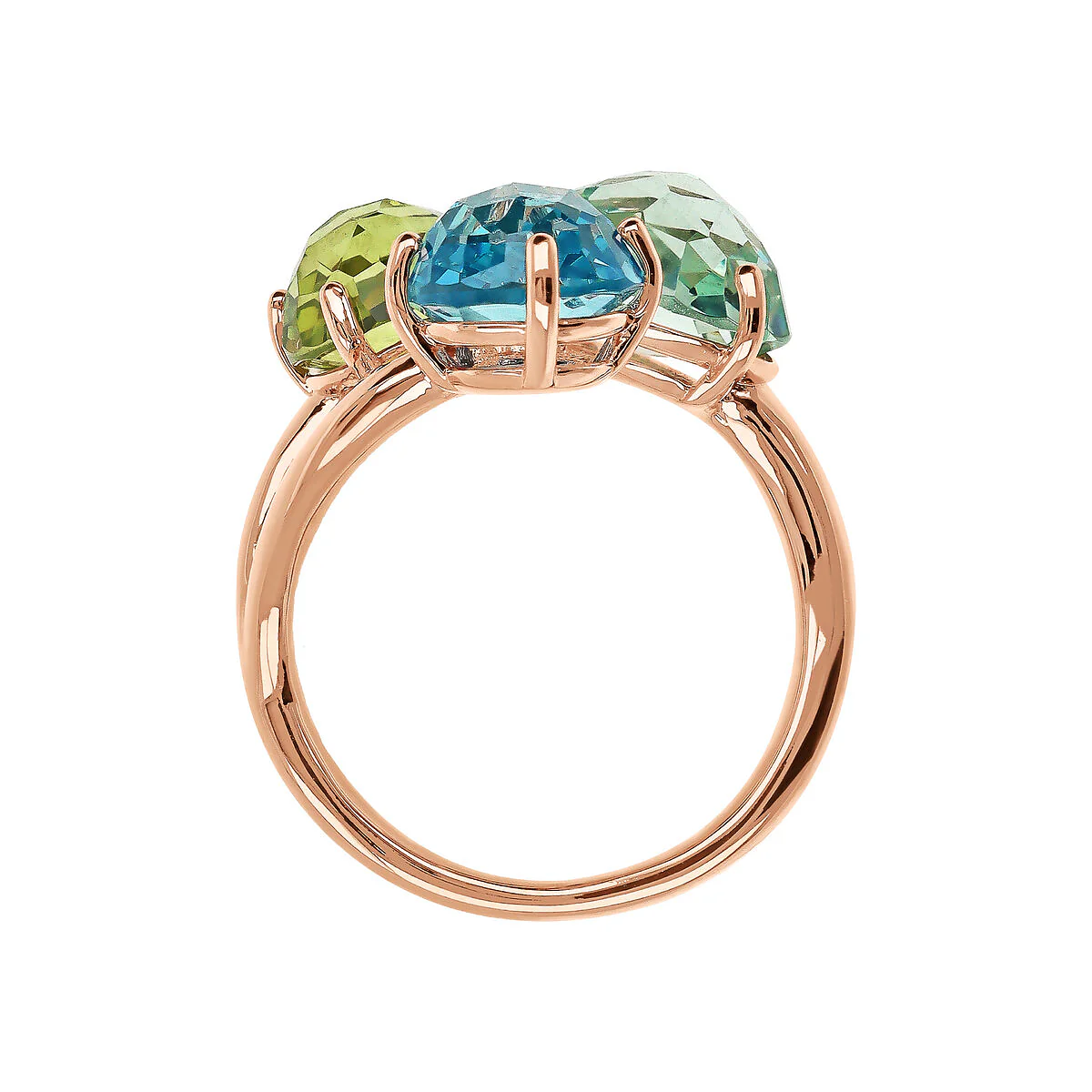 Anello trilogy Bronzallure realizzato in lega Golden Rosé, placcata Oro rosa 18kt, impreziosito da tre pietre prisma gem tonde (8/10 mm) dal taglio a mosaico.
