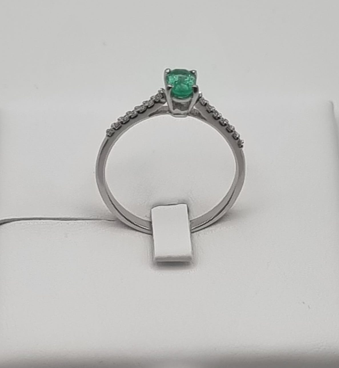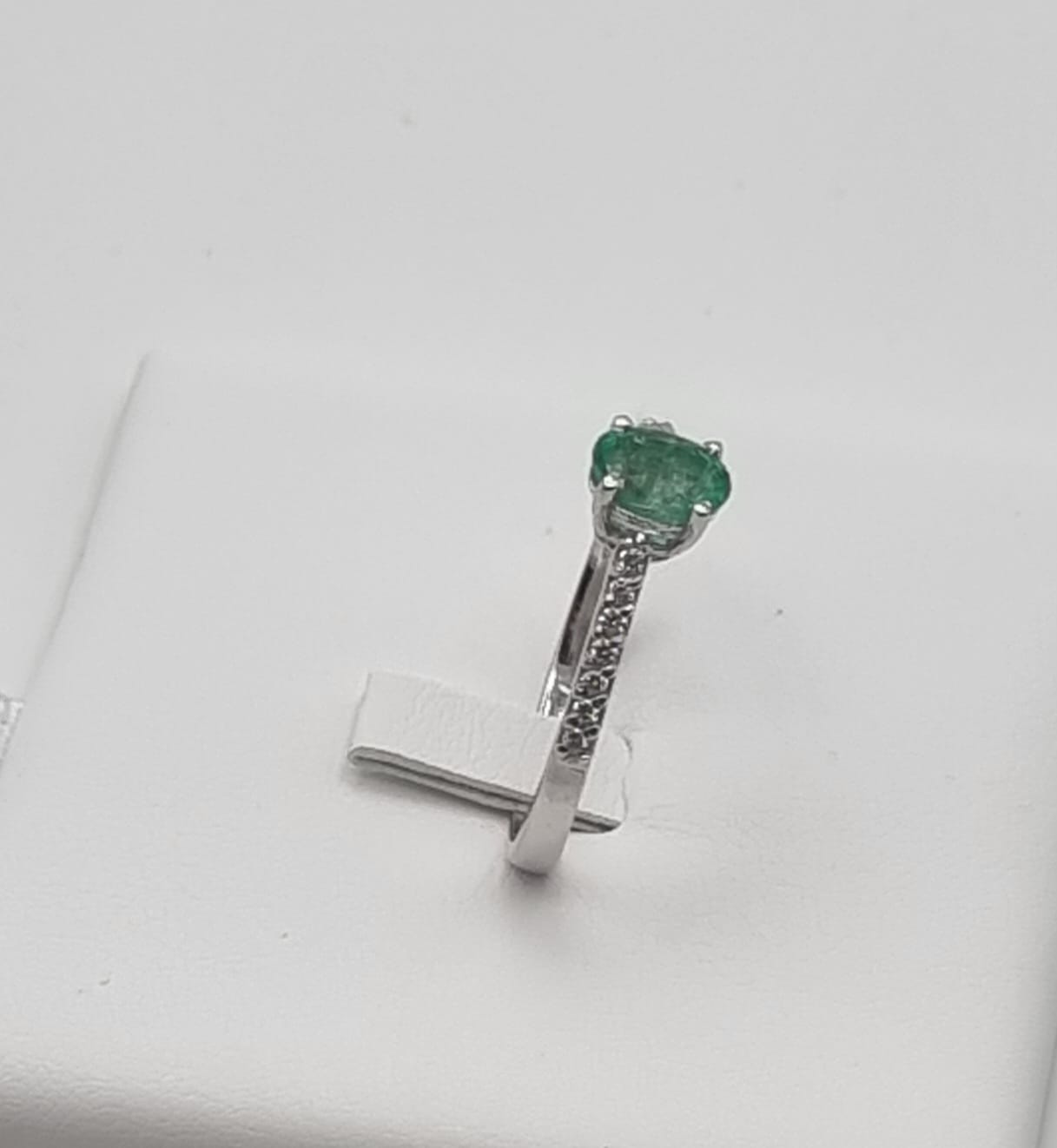 Anello realizzato in oro bianco 75o con Smeraldo taglio ovale di Kt. 0,45 affiancato sul gambo laterale dell’anello ci sono montati dei diamanti per una caratura totale di Kt. 0,10. E’ una inconfondibile reinterpretazione dei classici della gioielleria, elegante e raffinato, rappresenta il regalo perfetto per una occasione speciale. Made in Italy. Tutti gli articoli sono spediti nella caratteristica confezione corredata da garanzia.