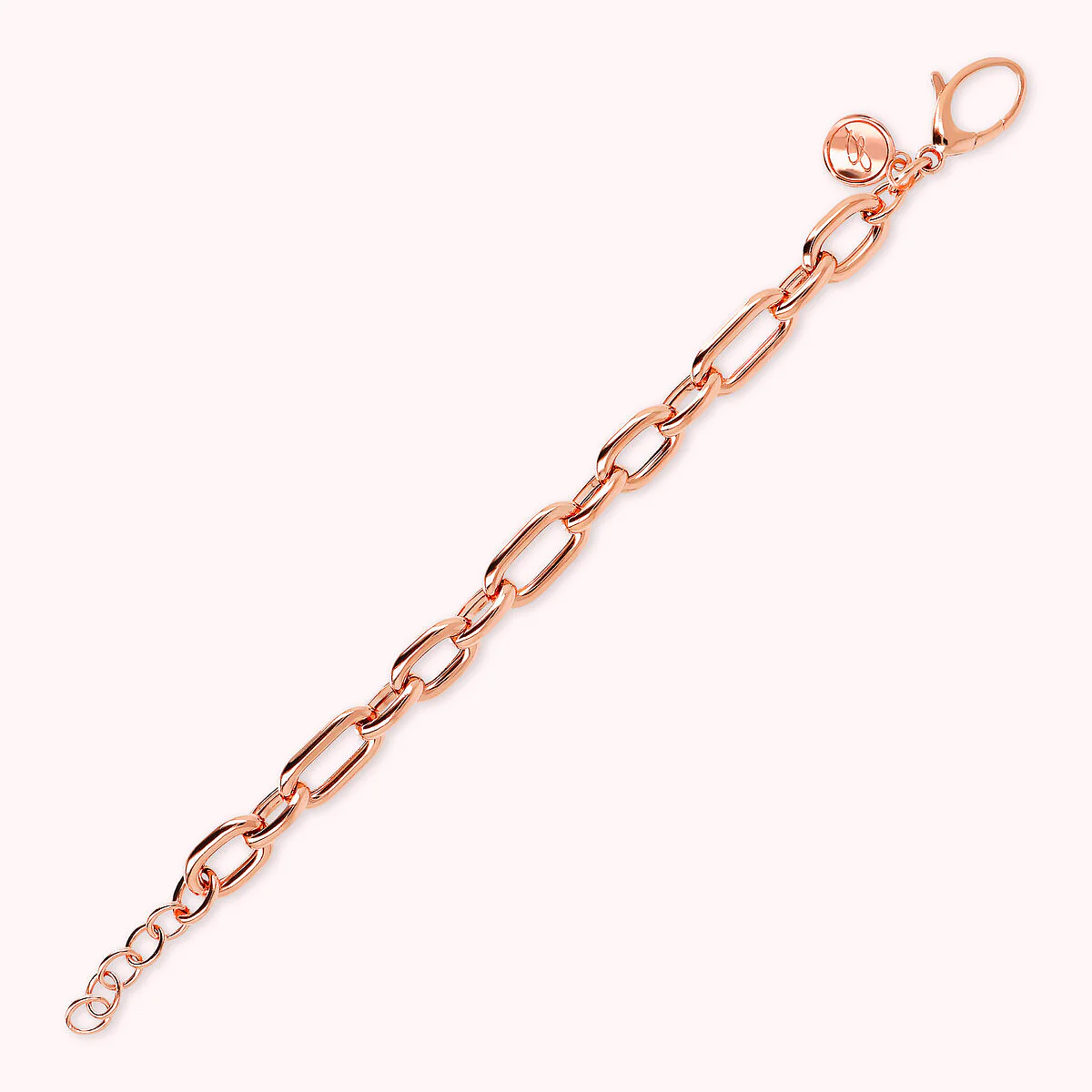 Bracciale Bronzallure realizzato in lega Golden Rosé la cui catena, placcata oro rosa 18kt, è formata dall’alternarsi di maglie allungate di dimensioni grandi e piccole; chiusura a moschettone con extender di 2.5 cm.