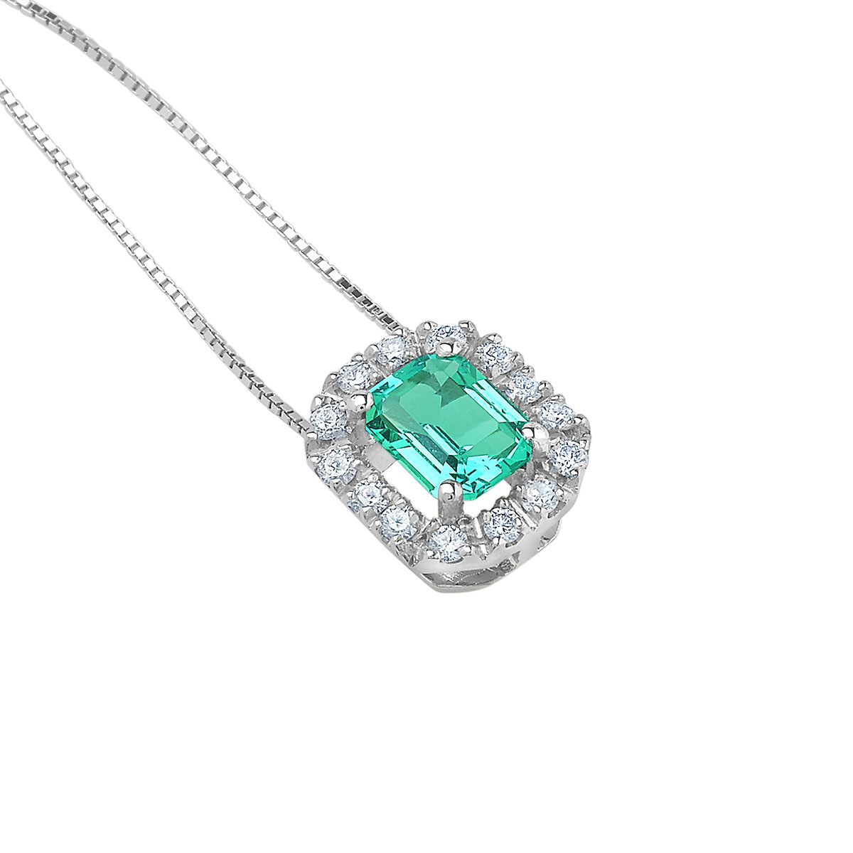 Collana girocollo da donna con ciondolo pendente in oro bianco 750 (18 Kt) Smeraldo verde ottagonale Lab Grown contornato da diamanti naturali taglio tondo brillante della collezione Pret a Porter di Bibigì Gioielli. Chiusura a moschettone tondo.
