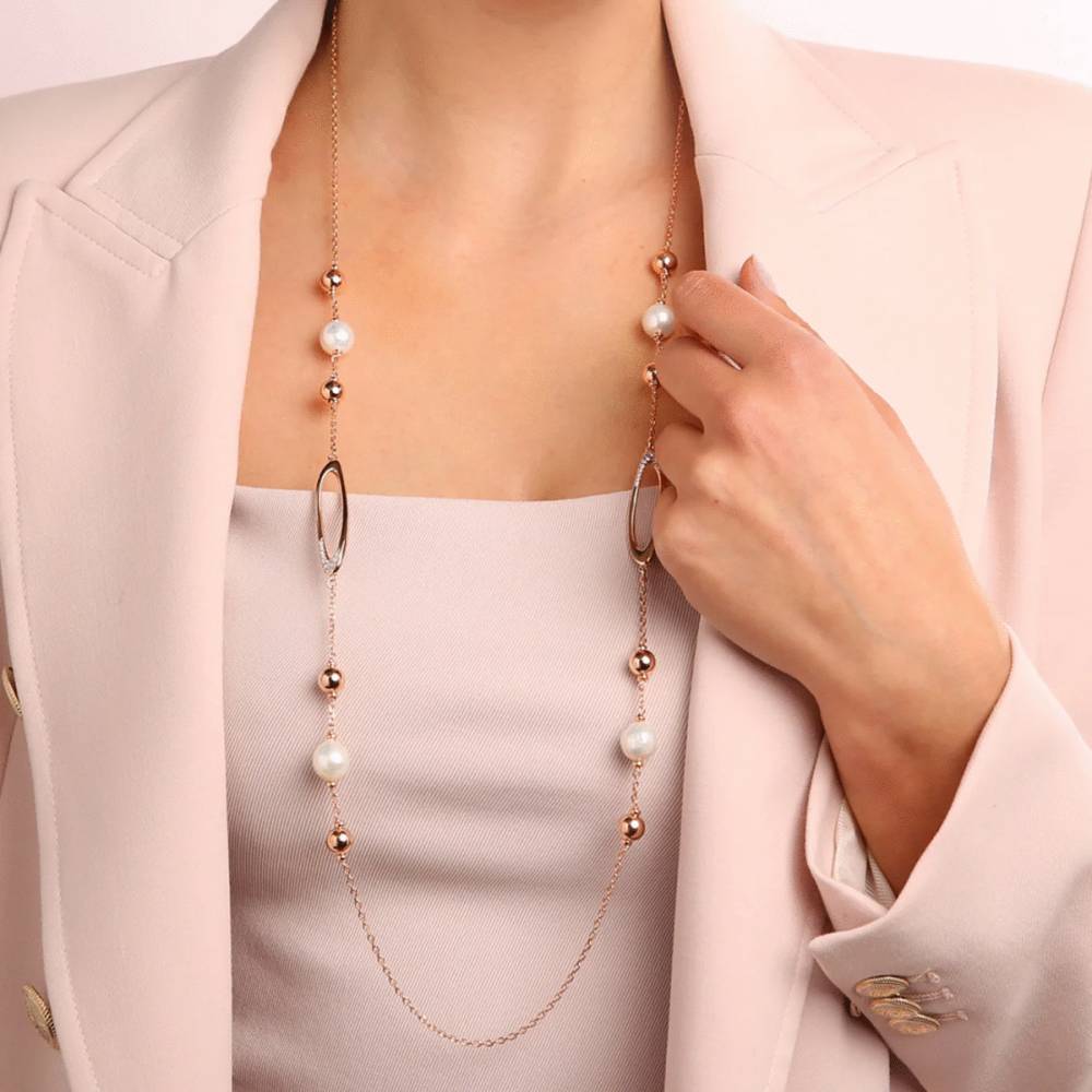Collana lunga Bronzallure realizzata con lega Golden Rosé, placcata oro rosa 18kt con catena rolo impreziosita da dettagli ovali con cubic zirconia e piccole sfere in Golden Rosé e perle coltivate d’acqua dolce (circa 12 mm); chiusura a moschettone. Creazione raffinata ed elegante, ideale da abbinare all’ampia gamma di gioielli della collezione Maxima che coniuga l’oro rosa e le migliori perle coltivate d’acqua dolce per un look chic.