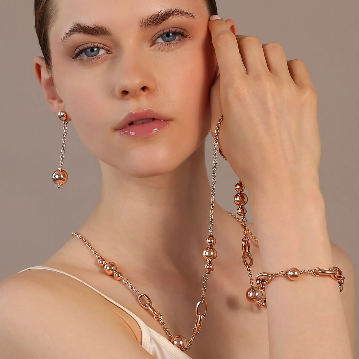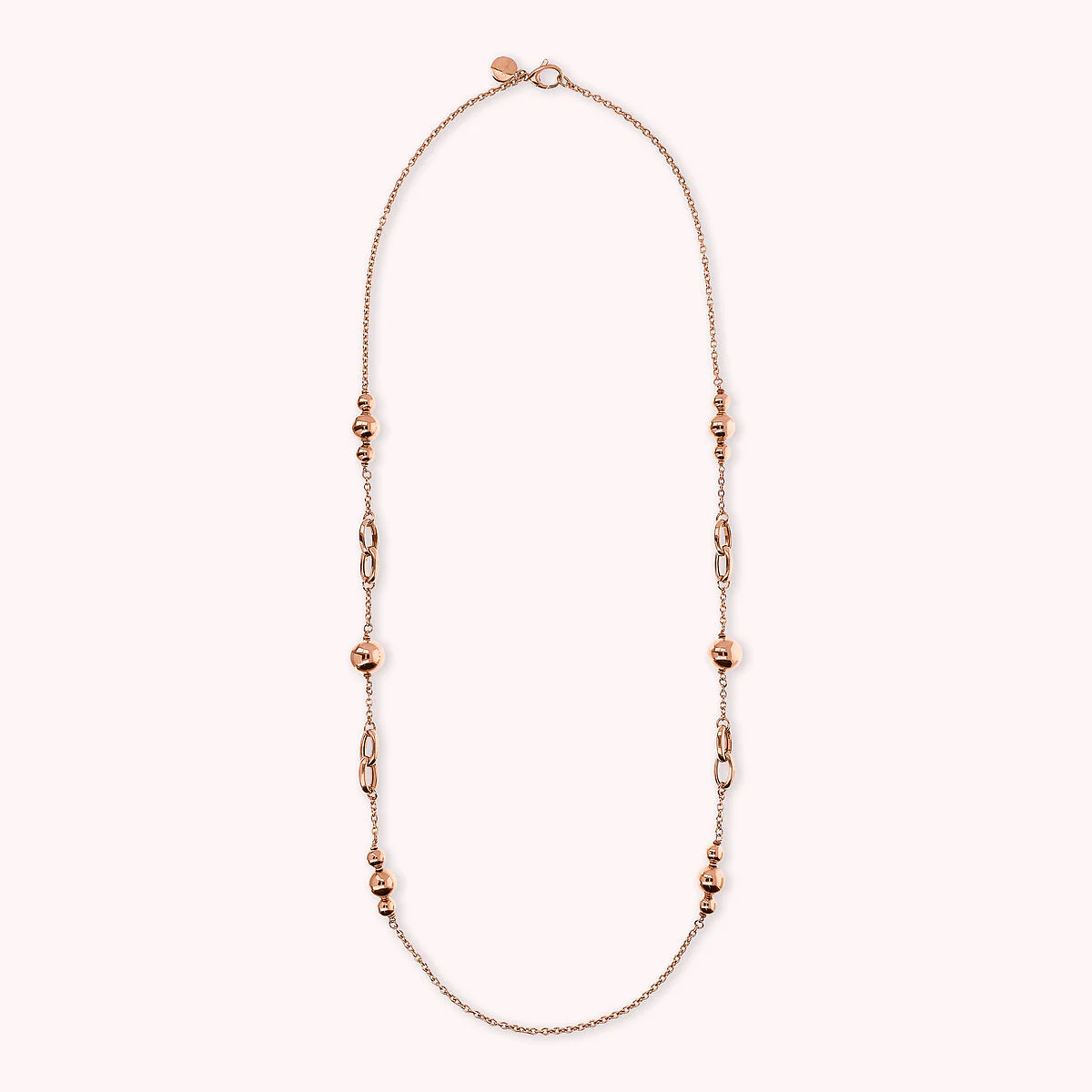 Collana lunga Bronzallure realizzata in lega Golden Rosé, placcata Oro rosa 18kt, con catena rolo impreziosita da station di maglie ovali intrecciate (16×10 mm) alternate a bead lucide piccole (8 mm), medie (12 mm) e grandi (14.5 mm). Lunghezza 94 cm. Chiusura a moschettone.