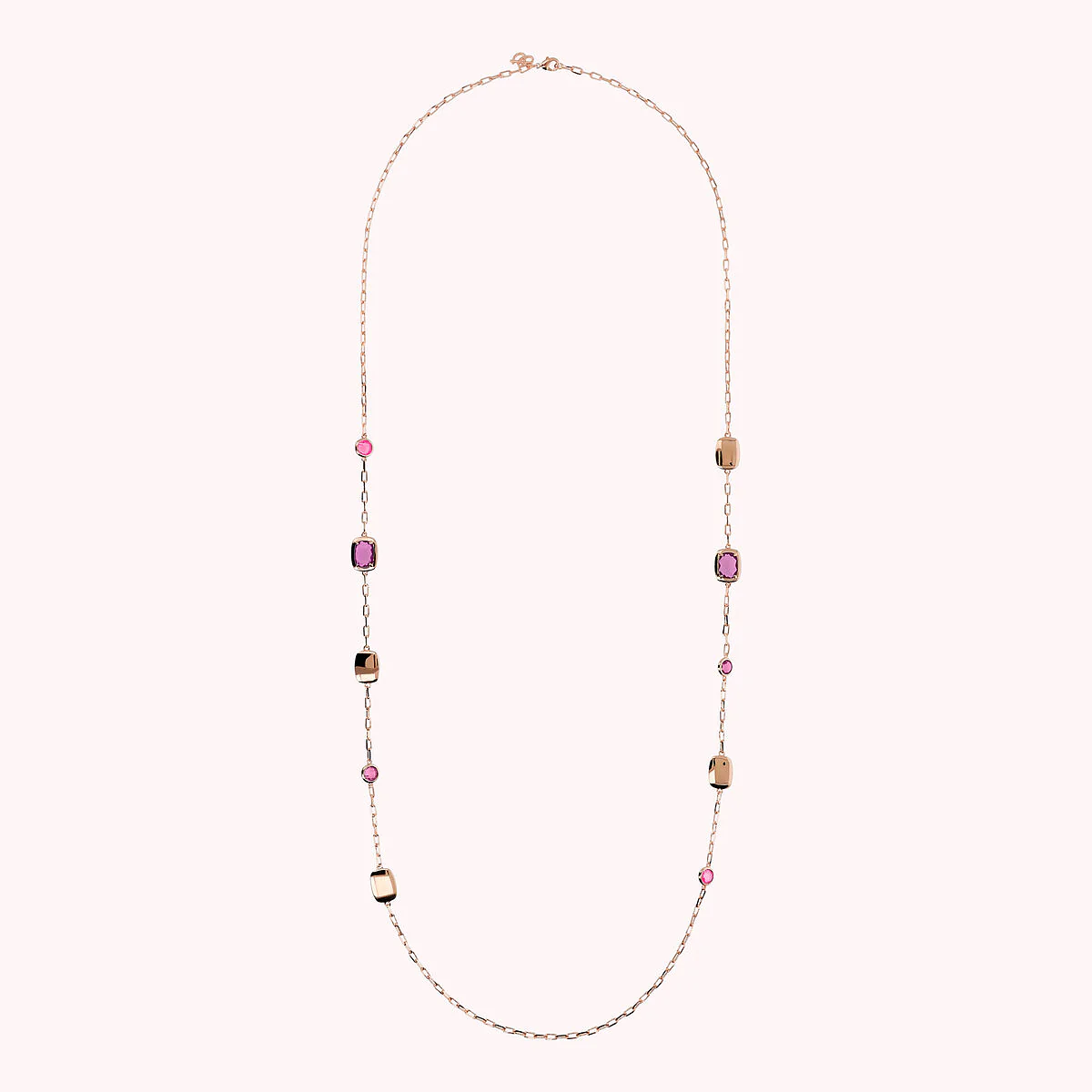 Collana lunga Bronzallure realizzata in lega Golden Rosé, placcata Oro rosa 18kt, con catena forzatina impreziosita da pepite lucide rettangolari (13×10 mm) alternate a prisma gem tonde (4.5 mm) e a baguette (13×10 mm). Lunghezza 93 cm. Chiusura a moschettone.