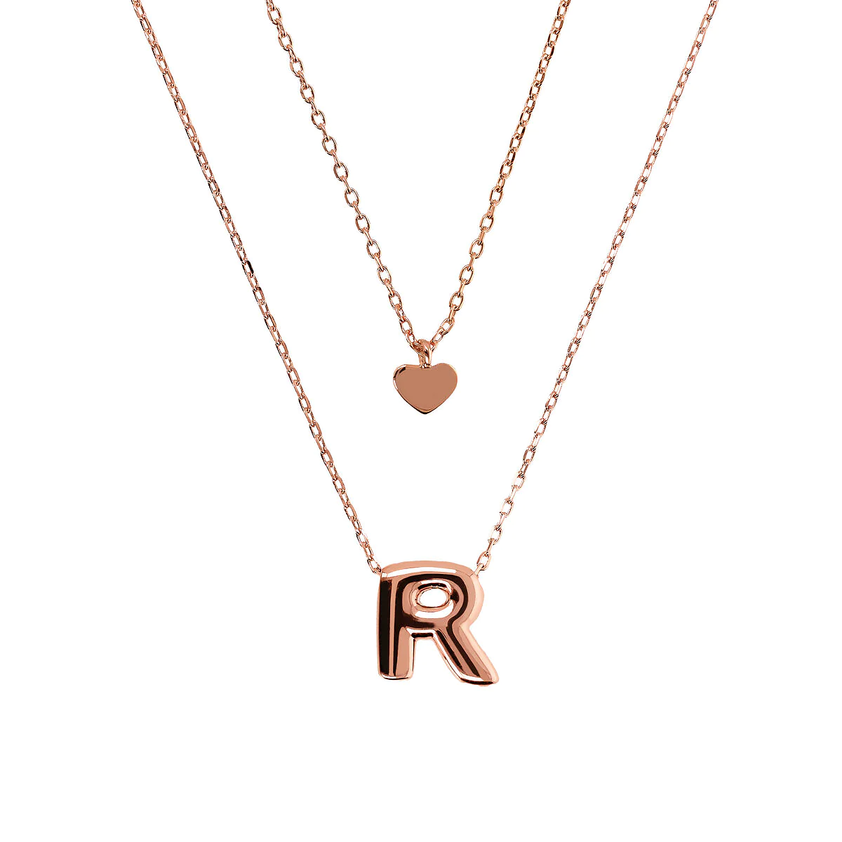 Collana graduata realizzata in lega Golden Rosé, placcata Oro rosa 18kt, con doppio filo di catena forzatina: sul filo più corto (39 cm) è presente un piccolo ciondolo cuore. Sul filo più lungo (45 cm) è presente un pendente con lettera. Chiusura a moschettone.