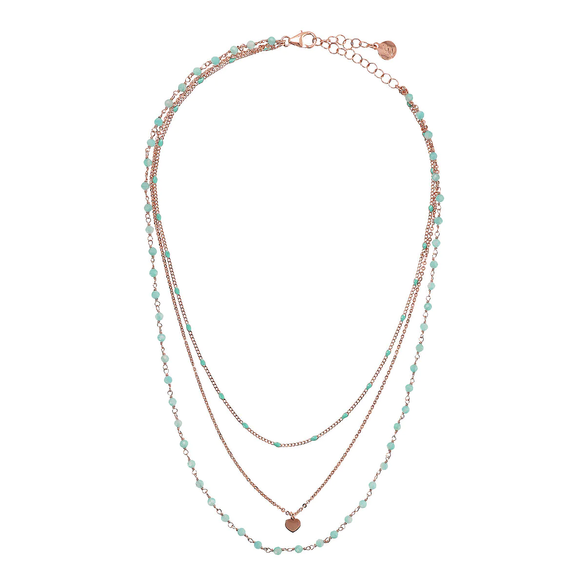 Collana multi-filo graduata realizzata in lega Golden Rosé, placcata Oro rosa 18kt, composta da tre fili: il più lungo (41 cm) è una catena rosario con pietre naturali sfaccettate (3/4 mm), in mezzo (37 cm) una catena rolo piatta è impreziosita da un ciondolo a cuore e il filo più corto (33 cm) è una catena grumetta sottile con elementi smaltati che richiamano il colore della pietra. Chiusura a moschettone.