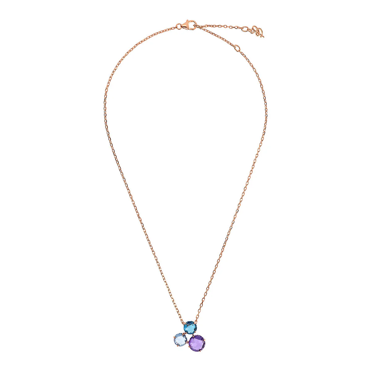 Collana Bronzallure realizzata in lega Golden Rosé, placcata Oro rosa 18kt, con pendente trilogy impreziosito da tre pietre prisma gem tonde (8/10 mm) dal taglio a mosaico. Lunghezza 47 cm regolabile da due anellini interposti a 41 e 44 cm. Chiusura a moschettone.