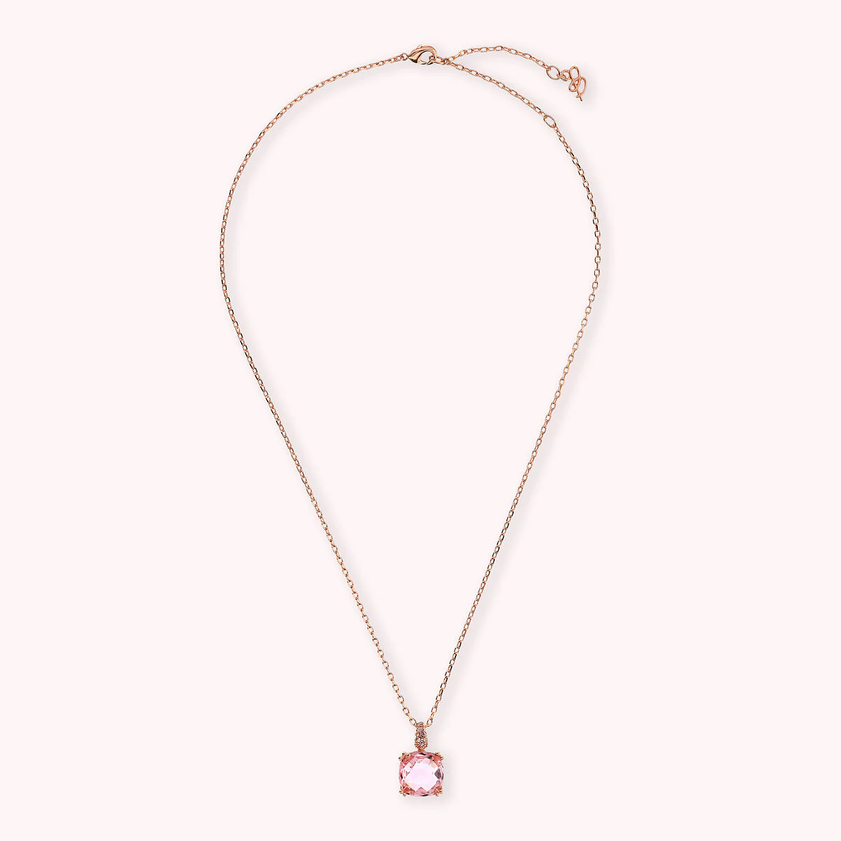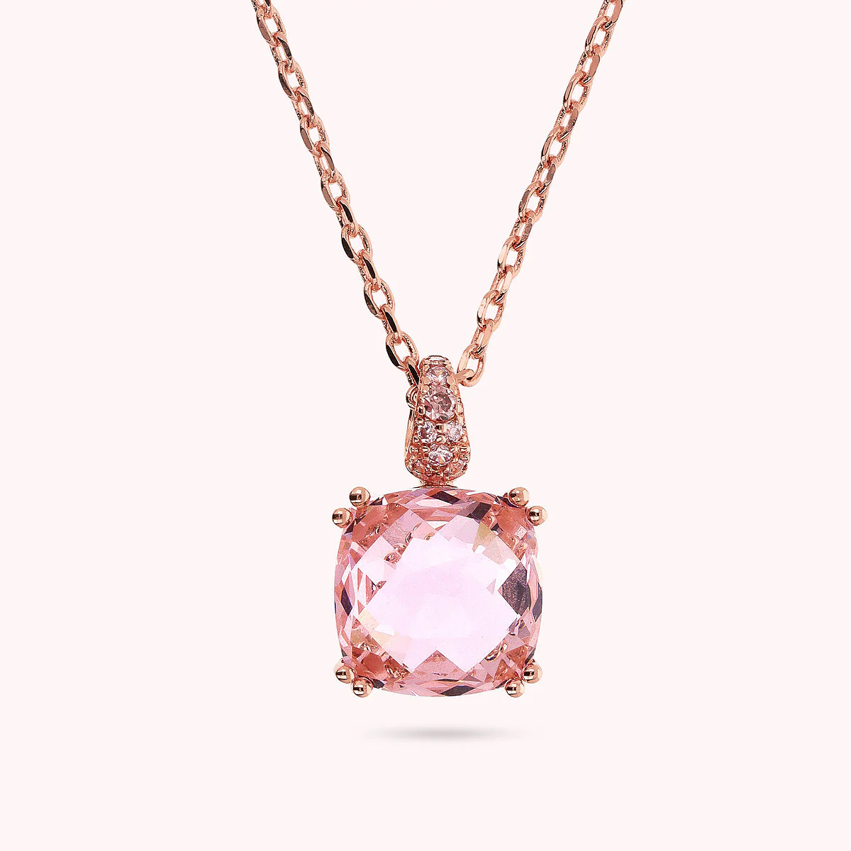 Collana Bronzallure realizzata in lega Golden Rosé, placcata oro rosa 18kt, con catena rolo impreziosita da una contro-maglia pavé e da un pendente quadrato in prisma gem (12×12 mm). Chiusura a moschettone con estensione.