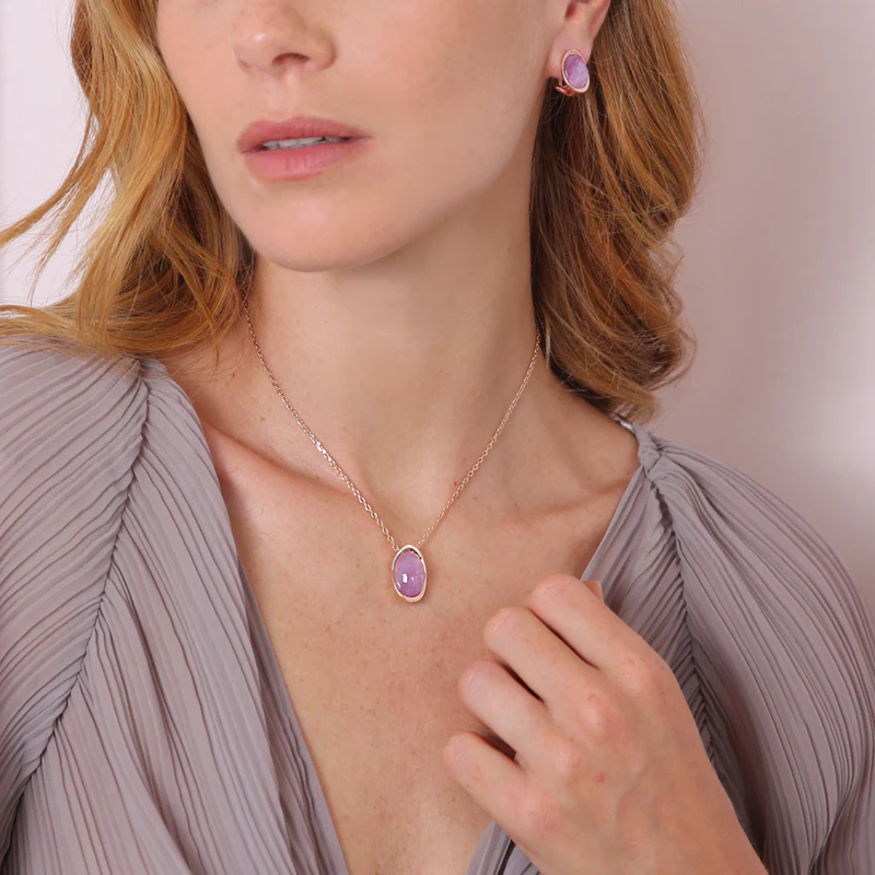 Collana Bronzallure realizzata su base Golden Rosé, placcata oro rosa 18kt, con catena forzatina impreziosita da un pendente in pietra naturale dalla forma ovale AMETISTA (12×17 mm) e superficie sfaccettata; chiusura a moschettone con extender.