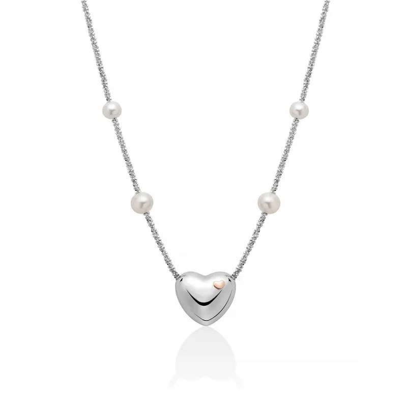 La collana è caratterizzata da un cuore centrale con un piccolo elemento in oro 750 (18KT) ed impreziosita da due perle bianche coltivate di acqua dolce dal diametro di 7-7,5 mm.