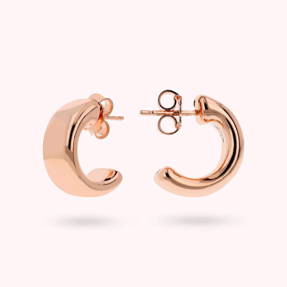 Orecchini a lobo Bronzallure realizzati in lega Golden Rosé, placcata Oro rosa 18kt, dalla forma a semi-cerchio e superficie lucida. Chiusura a perno e farfalla.