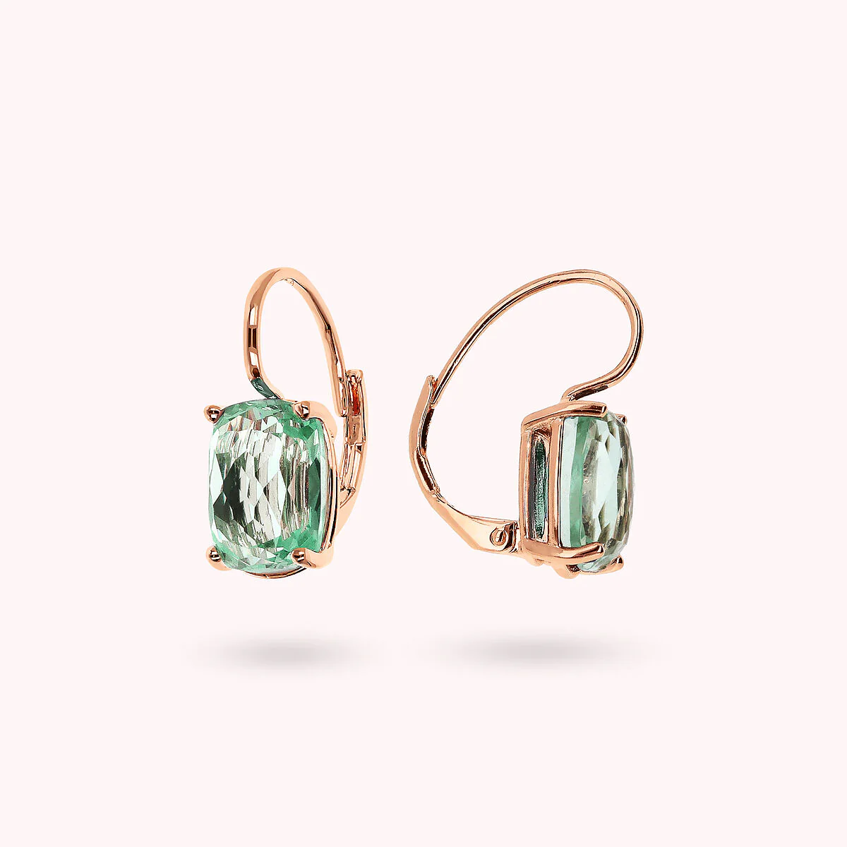 Orecchini pendenti Bronzallure realizzati in lega Golden Rosé, placcata Oro rosa 18kt, impreziositi da due pietre prisma gem rettangolari (8×11) dal taglio a mosaico. Chiusura a monachella.