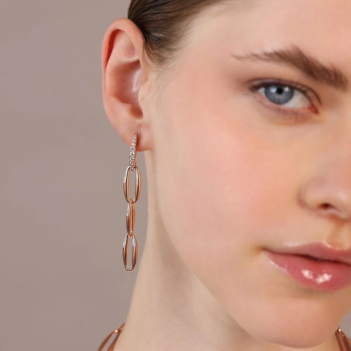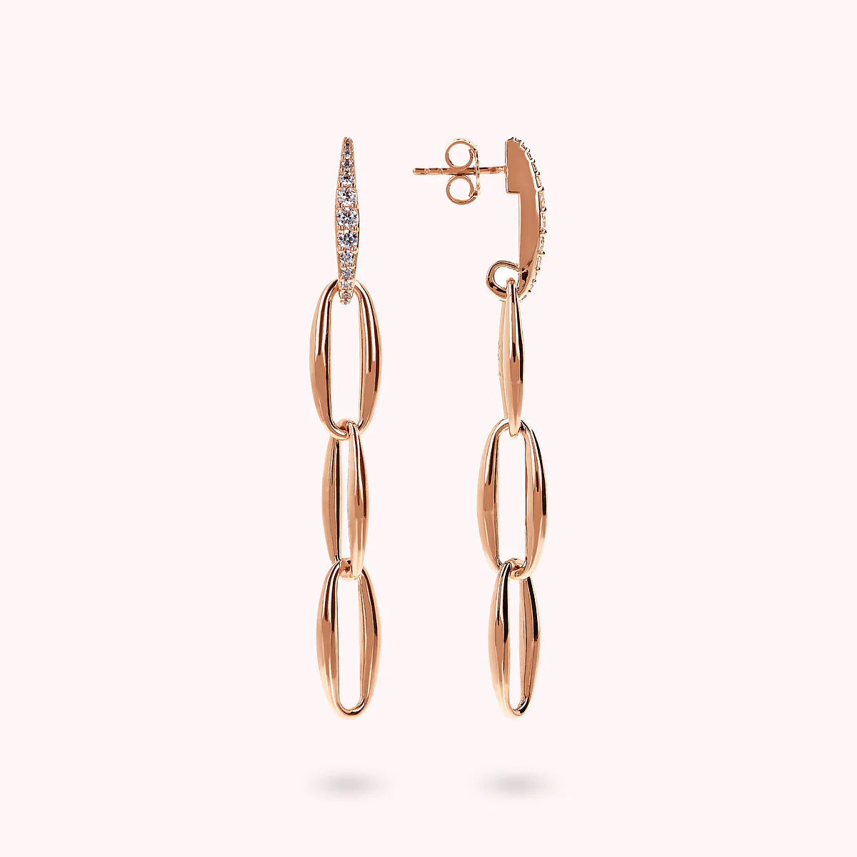 Orecchini pendenti Bronzallure realizzati in lega Golden Rosé, placcata Oro rosa 18kt, con maglie marquise lucide e contro-maglia in pavé di cubic zirconia, qualità luminosa. Lunghezza 6.5 cm. Chiusura a perno e farfalla.