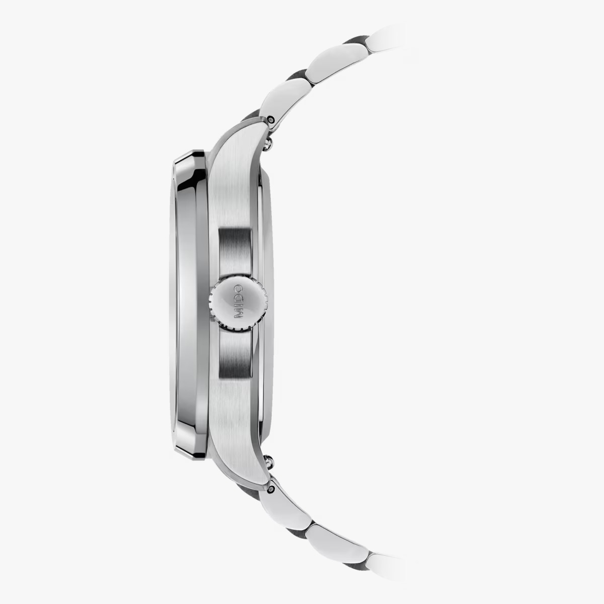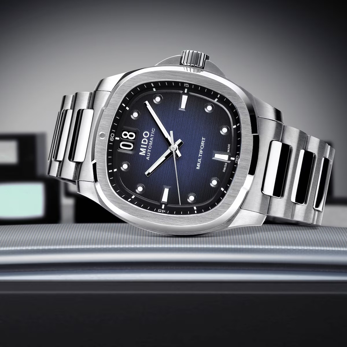Un brillante ritorno di fiamma! Nata dallo straordinario patrimonio di MIDO, la cassa a forma di TV torna al centro della scena per il Multifort TV Big Date, tanto intenso quanto preciso, grazie al suo formidabile movimento meccanico. Il design moderno e dinamico di questo orologio svizzero è sottolineato da un quadrante spazzolato orizzontale di grande impatto e dalla sua funzione distintiva: la scritta BIG DATE a ore 12. Il suo formidabile movimento automatico di ultima generazione, il Calibro 80, è dotato di una spirale high-tech in Nivachron™ che offre un’eccezionale resistenza agli urti e ai campi magnetici.
